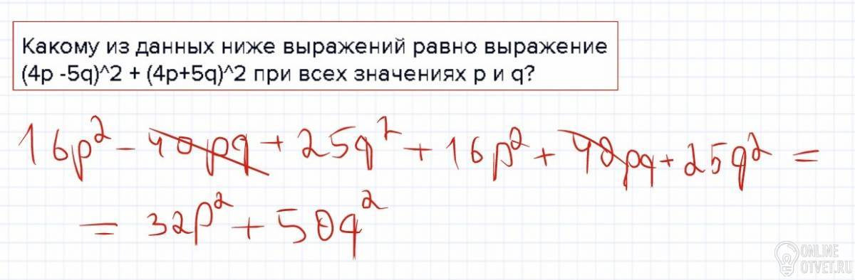 Какому из данных ниже выражений равно выражение (4p -5q)^2 + (4p+5q)^2 при всех значениях p и q?