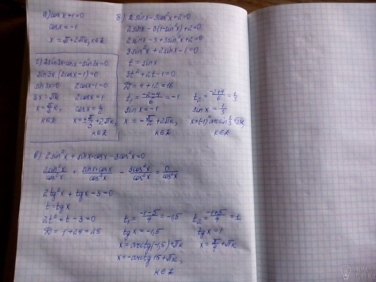 Решите уравнения: a) cos x +1=0; б)2sin x -3cos²x+2=0; в)2sin²x+sin x•cos x-3cos²x=0; г)2sin3x•cos x-sin3x=0.