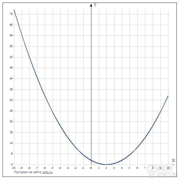 б) Найдем ось симметрии параболы. Правая ветвь будет возрастающей, левая убывающей. Ось параболы x=2. Справа от оси большему х соответствует большее y, слева - меньшему x - большее y. Функция возрастает при x принадлежащем промежутку [2;+∞)