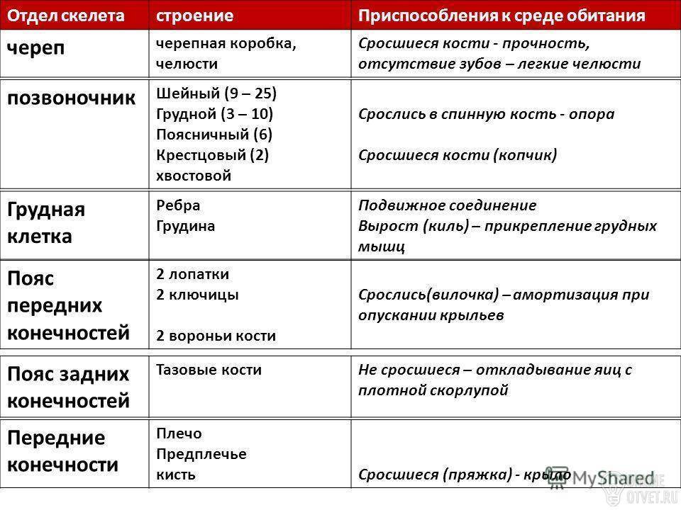Скелет парных конечностей и их поясов. У птиц скелет передних конечностей (пояс и свободная конечность) имеет черты преемственные от рептилий, но в связи с приспособлением к полету отличаются рядом особенностей. Приспособления к полету отчетливо выражены в поясе передних конечностей. Пояс включает лопатки, каракоиды (вороньи кости) и ключицы. Мощные коракоиды расширенными нижними концами прочно соединяются малоподвижными суставами с передним концом грудины. Узкие и длинные лопатки срастаются со свободными концами коракоидов, образуя глубокую суставную впадину для головки плеча. Крепость костей плечевого пояса и их прочное соединение с грудиной обеспечивает крыльям опору в полете. Удлинение коракоидов увеличивает площадь прикрепления мышц крыла и выносит вперед, на уровень шейных позвонков, плечевой сустав; это позволяет укладывать крыло сбоку туловища в покое и выгодно аэродинамически, т.к. в полете центр тяжести птицы оказывается на линии, соединяющей центры площадей крыльев (обеспечивается устойчивость). Ключицы срастаются в вилочку, расположенную между свободными концами коракоидов и выполняющую роль амортизатора, смягчающего толчки при взмахах крыла.