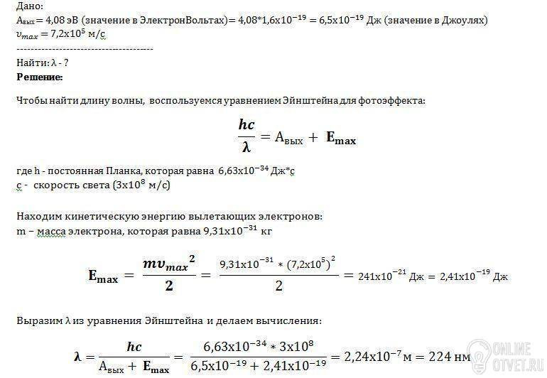 Какой должна быть длина λ электромагнитного излучения, падающего на кадмий, чтобы при фотоэффекте величина максимальной скорости вылетающих электронов была равна v = 7,2 · 105 м/с. Работа выхода электрона из кадмия А = 4,1 эВ; постоянная Планка h = 6,6 · 10-34 Дж·с; скорость света в вакууме с = 3 · 108 м/с; масса электрона m = 0,9 · 10-30 кг.