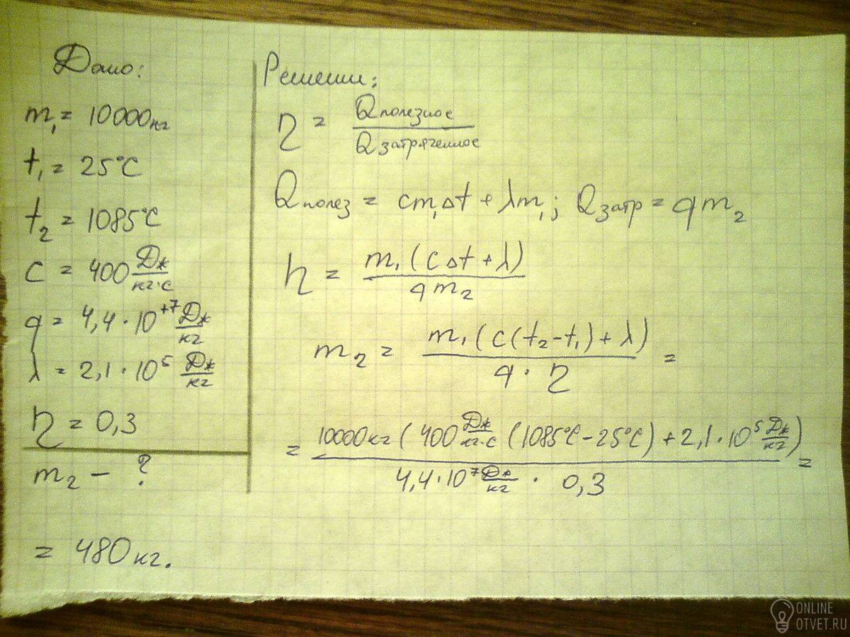 Сколько потребуется сжечь нефти в плавильной печи КПД 30%, чтобы довести до температуры плавления и расплавить 10 т меди? Начальная температура меди 25С
