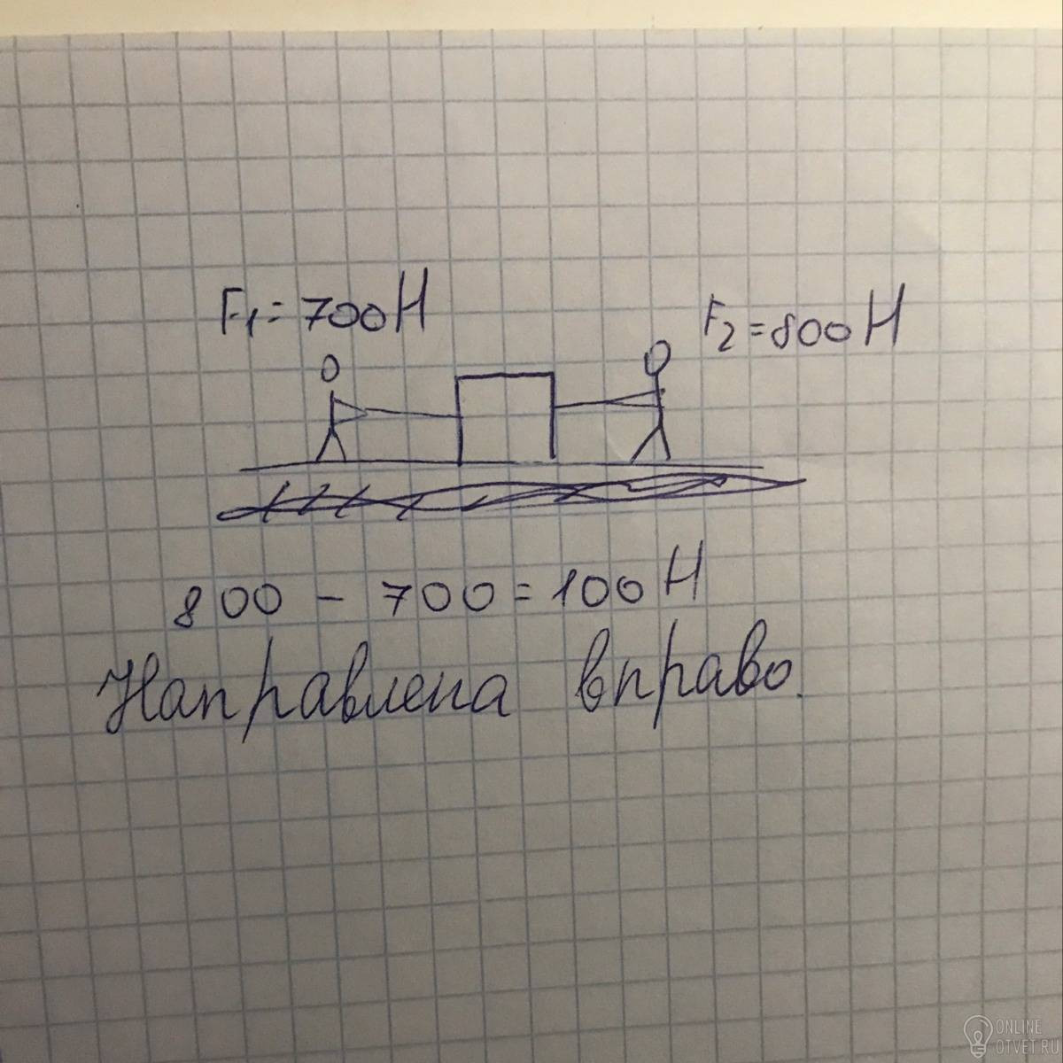 Два человека перетягивают канат. один тянет влево с силой 700Н, второй вправо с силой 800 Н. Чему же равна равнодействующая этих сил? Куда направлена?