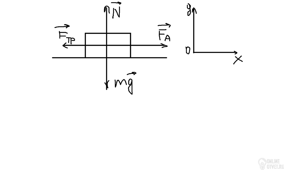 Пример ma=Fтр+N+mg+Fa (в векторном виде) проекция на ось OX a=0 значиит 0=Fтр-Fa ==>Fтр=Fa проекция на ось OY 0=N-mg ==> N=mg