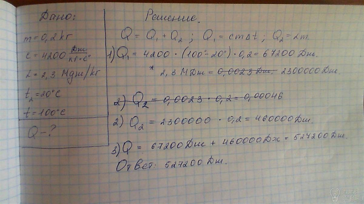 Помогите пожалуйста! С Формулами и подставленными цифрами! Какое количество теплоты потребуется для обращения в пар 200г воды, взятой при температуре 20*С? Удельная теплоемкость воды 4200 Дж/(кг*С), удельная теплота парообразования 2.3 МДж/кг.