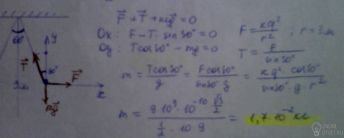 Два одинаковых шарика подвешены на нитях длиной 3 м, закрепленных в одной точке. После того как шарикам сообщили заряды 10 в -5 степени Кл, нити разошлись на 60градусов. Найдите массу шариков.