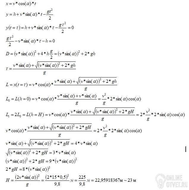 Тело бросают с поверхности земли под углом 30° к горизонту с начальной скоростью 15 м/с. На какую высоту необходимо поднять точку бросания, чтобы дальность полета увеличилась в 2 раза (угол и начальная скорость неизменны)? Ответ округлите до целых. Ускорение свободного падения считать равным 9,8 м/с2. Сопротивление воздуха не учитывать. решение