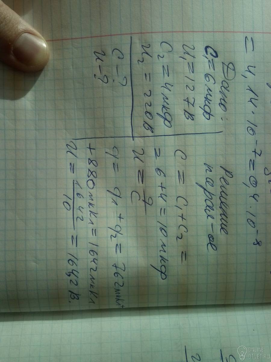Помогите пожалуйста с физикой! конденсатор емкостью 6 мкФ заряжен до напряжения 127 в, соединили параллельно с конденсатором, емкость которого 4 мкФ, а напряжение на его обкладках 220 В. Определите емкость батареи и напряжение на ее зажимах. Очень буду благодарен за подробный ответ, также очень прошу написать ответ на листе бумаги и переслать по возможности!