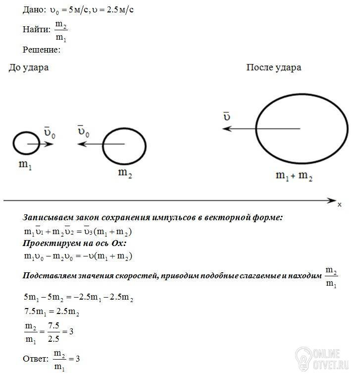Два тела, летящие навстречу друг другу со скоростями V0 = 5 м/с каждое, после абсолютно неупругого удара стали двигаться как единое целое со скорость V = 2,5 м/с. Чему равно отношение масс этих тел ?