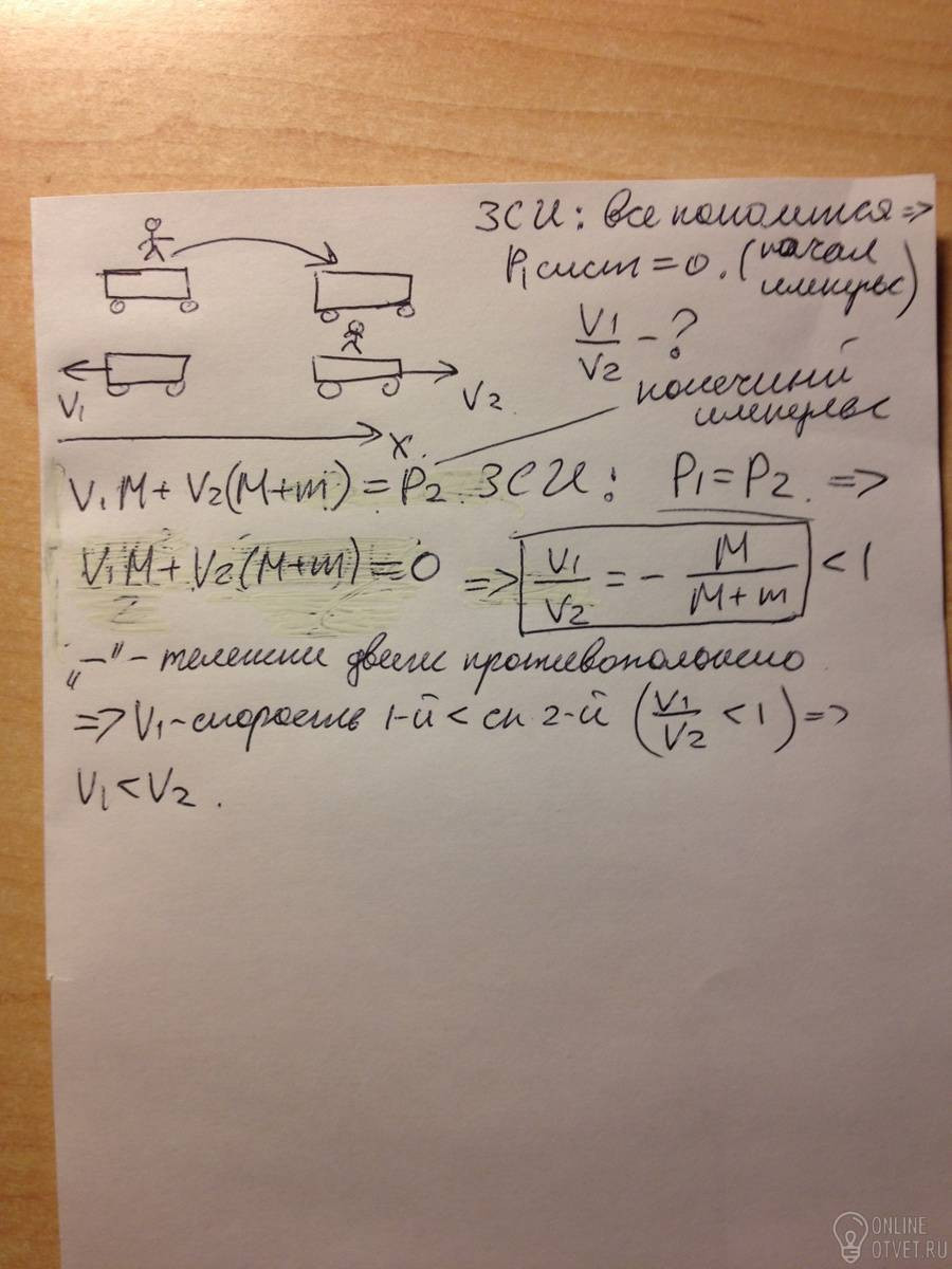 На реалистах недалеко друг друга стоят две тележки массой M каждая. На первой из них стоит человек массой m. Человек перепрыгивает с первой тележки на вторую. Скорость какой тележки будет больше? Чему равно отношение скоростей тележек? Подробное объяснение!