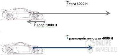 Сила тяги автомобиля равна 5000 Н, сила сопротивления движению - 1 кН. Найти равнодействующую этих сил.