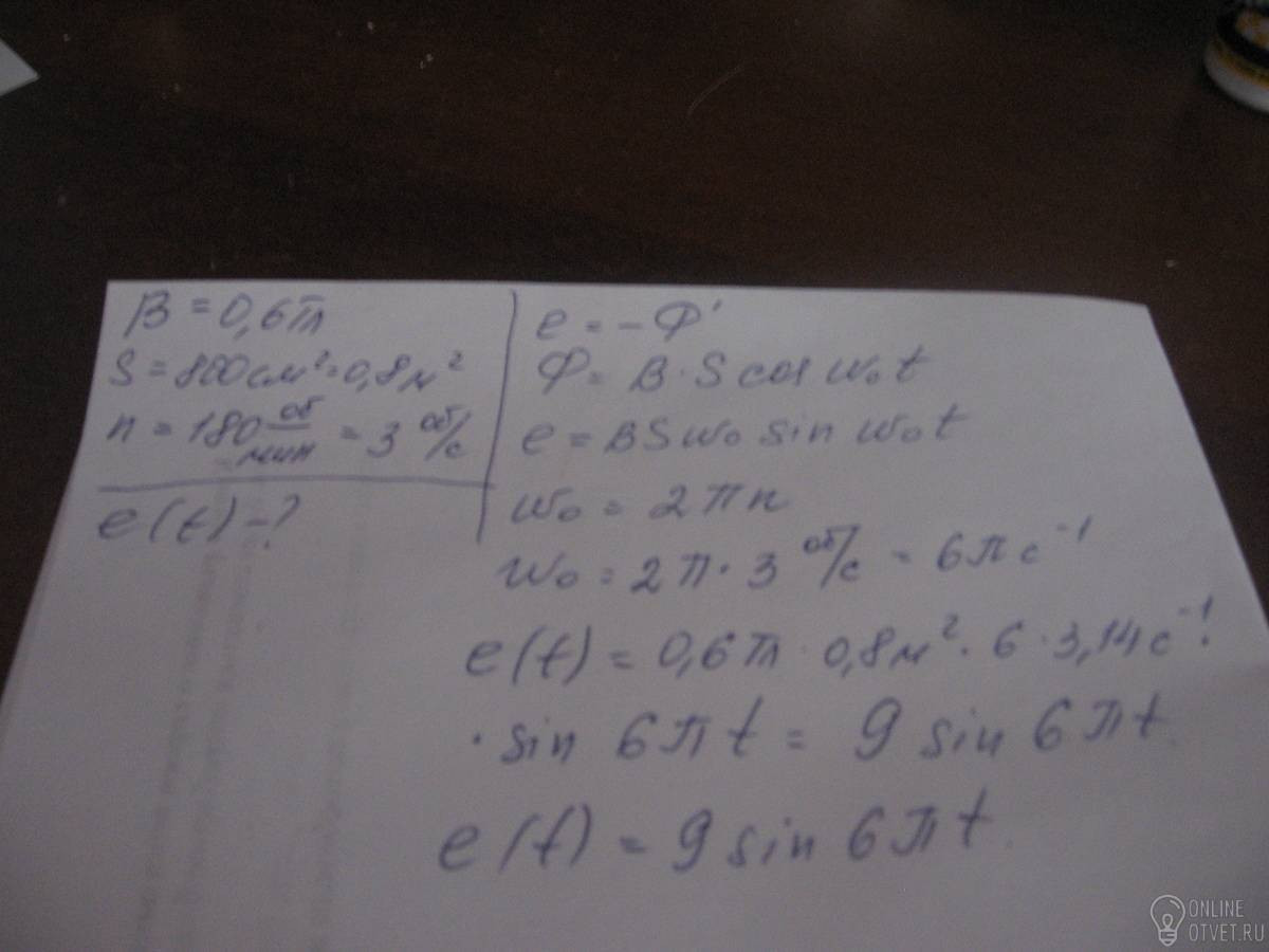В однородном магнитном поле с индукцией 0.6 Тл равномерно вращается прямоугольная рамка 20х40 см. Найти зависимость e(i), если рамка делает 180 об/мин.