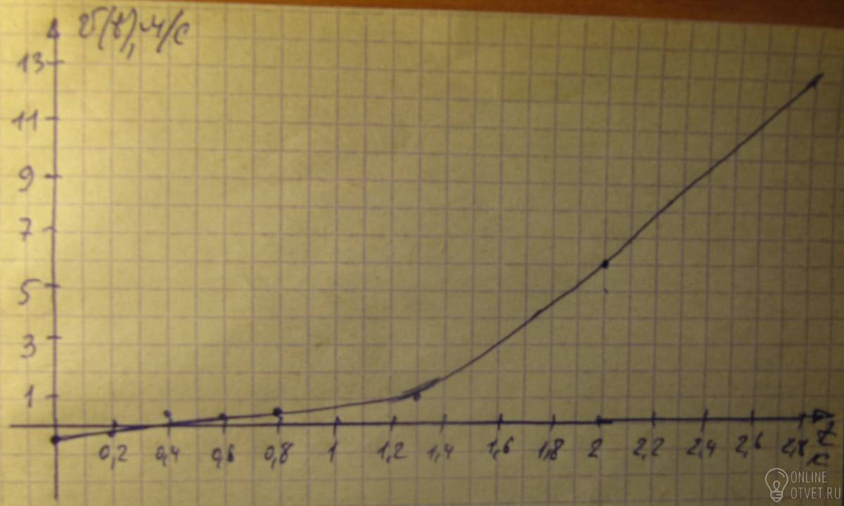 Скорость ищем как производную от уравнения движения: v(t)=-0,2+1,5*t²⇒v(5)=-0,2+25*1,5=37,3 м/с. Ускорение ищем как производную от скорости: a(t)=3*t. График v(t) строим по точкам: t= 0 0,2 0,4 0,6 0,8 1 1,5 2 3 v(t)= -0,2 -0,14 0,04 0,34 0,76 1,3 3,175 5,8 13,3 График в отдельном файле.