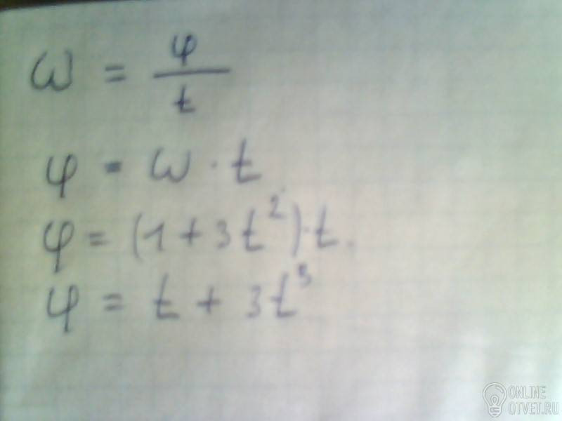 Диск радиусом 10см начинает вращаться вокруг неподвижной оси.зависимость угловой скорости диска от времени задается уравнением: w=1+3t в квадрате .какая функция описывает зависимость угла поворота диска от времени