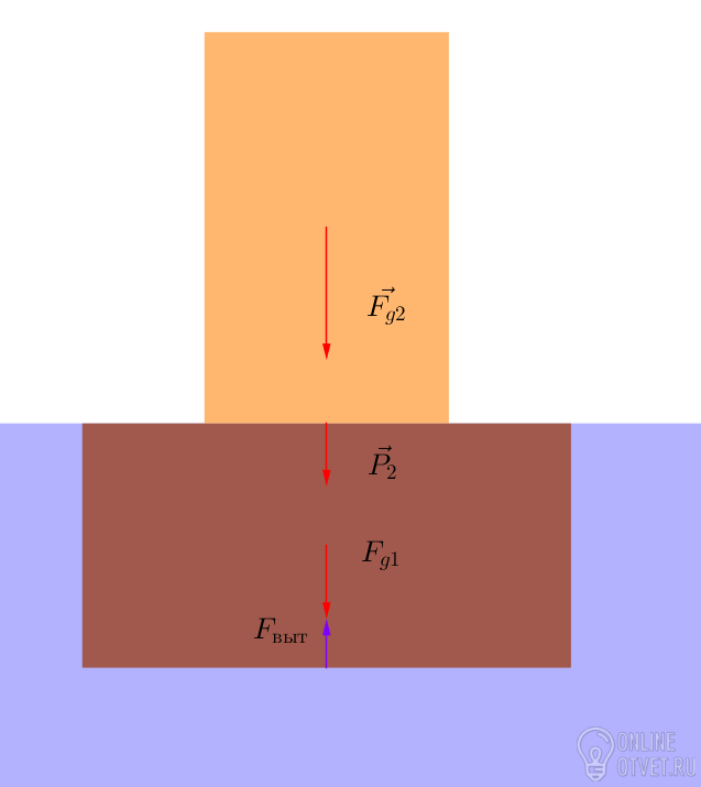Таким образом общий вес складывается из силы тяжести обоих грузов, теперь решим уравнение [1] m-масса деревянного груза M-масса груза который кладем V-объем деревянного груза(он польностью погружен)) ρ 1 - плотность воды ρ 2- плотность дерева