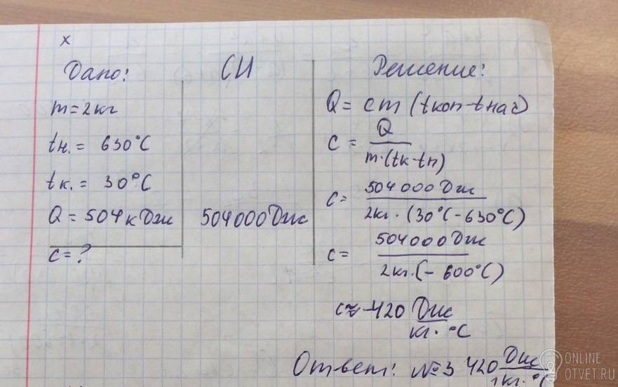 Металлический подсвечник массой 2кг нагрели до температуры 630°C. При остывании подсвечника до температуры 30°C выделилось количество теплоты, равное 504кДж. Чему равна удельная теплоёмкость вещества подсвечника?