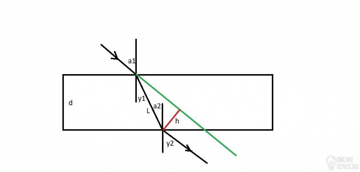 N=1.7 d=1 см α1=45° h=? === h/L=sin(α1-γ1) ---> L=h/(sin(α1-γ1)) d=h*cosγ1/(sin(α1-γ1)) sin(α1-γ1)=sinα1*cosγ1-cosα1*sinγ1 d=h/(sinα1-cosα1*sinγ1/cosγ1) sinγ1=sinα1/n d=h/(sinα1*(1-cosα1/√(n²-sin²α1))) h=d*sinα1*(1-cosα1/√(n²-sin²α1))=1*0.7*(1-0.7/√(1.7²-0.7²))≈0.385 см (3,85 мм) ============= Рисунок в приложении =====================
