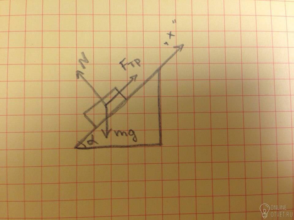 2) Запишем уравнение на ось x (на картинке) Fтр = mg * cos(90 - α) = 4.5 * 10 * 0.5 = 22.5 H
