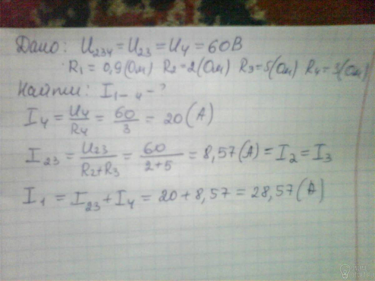 Четыре резистора соединены по схеме. Напряжение на концах цепи 60В. Определите напряжение на каждом участке цепи, если R1=0,9 Ом;. R2=2 Ом;R3=5 Ом и R4=3 Ом