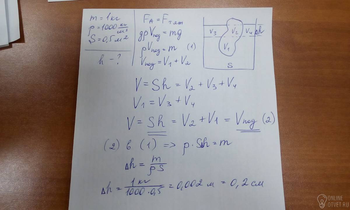 В цилиндрическую бочку с водой погружают тело массы m=1 кг неизвестной формы, плотность материала тела меньше плотности воды P=1000 кг/м3 Найти высоту подъема уровня жидкости относительно первоначального, если площадь дна бочки S=0,5 м3 Ответ дайте в сантиметрах.