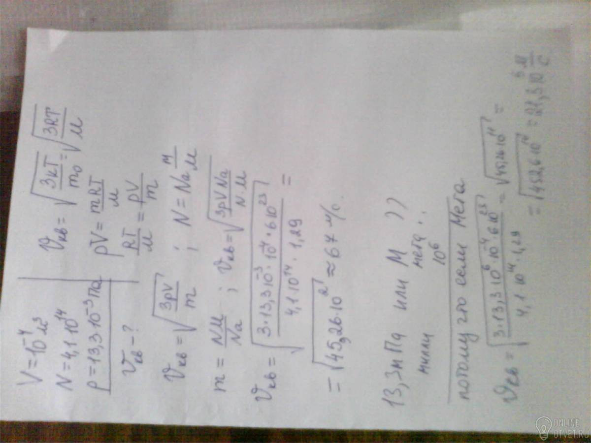 в баллоне радиолампы объемом 10^-4 м^3 находится 4,1*10^14 молекул воздуха.Определить среднюю квадратичную скорость молекул, если давление в лампе 13,3 мПа .