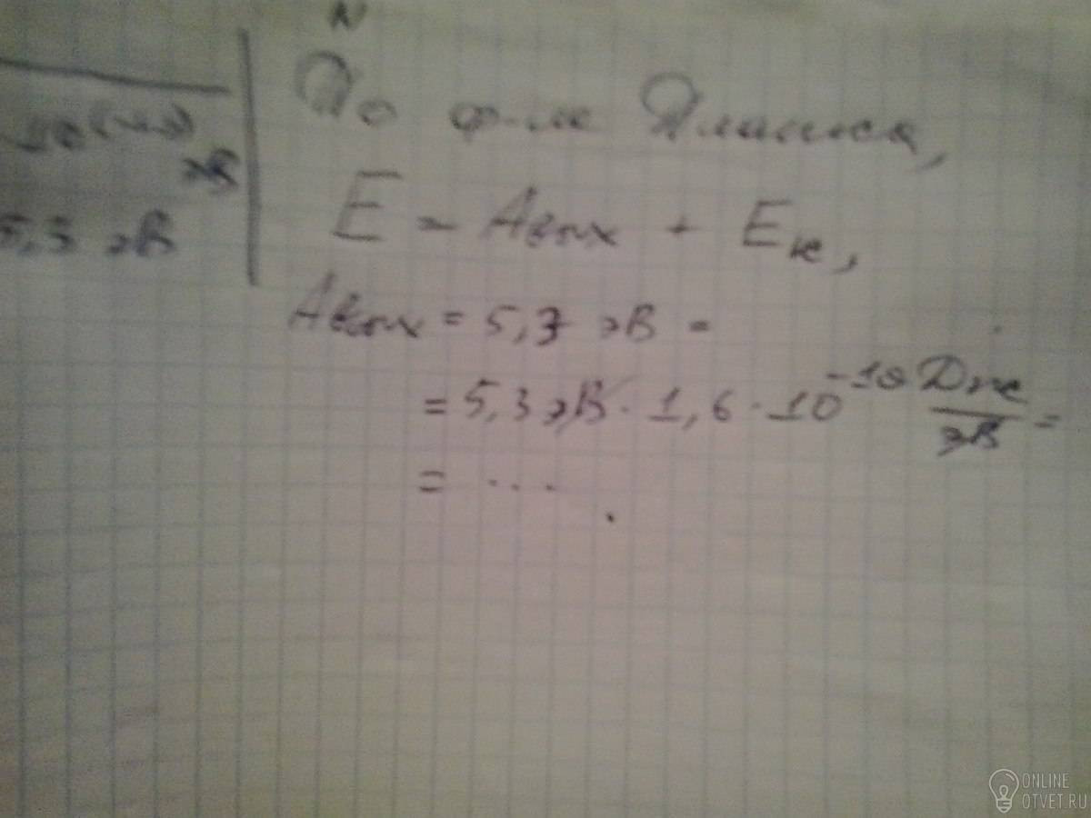 Определите энергию фотона при падении которого на платиновую пластину электрон приобрел кинетическую энергию равную 1,6*10^(-19) эВ. Работа выхода электронов пластины равна 5,3 эВ. С решением пожалуйста!