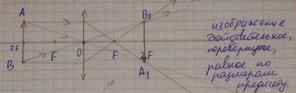 №3 Линза собирающая. d =2F. Изображение действительное, обратное, равное по размерам предмету.