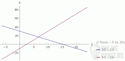 Оба графика - равномерное движение точка пересечения x = x1=x2 30 - 2t = -10 +4t 40 = 6t t =40/6 = 6,7 c время встречи x1 = 30 - 2*40/6 = 50 /3 = 16,7 м место встречи ГРАФИК прилагается