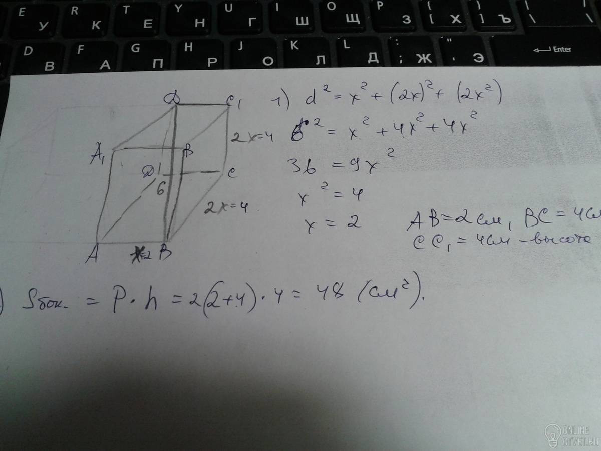 В 1) диагональ в квадрате=сумме квадратов 3-х измерений.Sбок=периметр*на высоту.