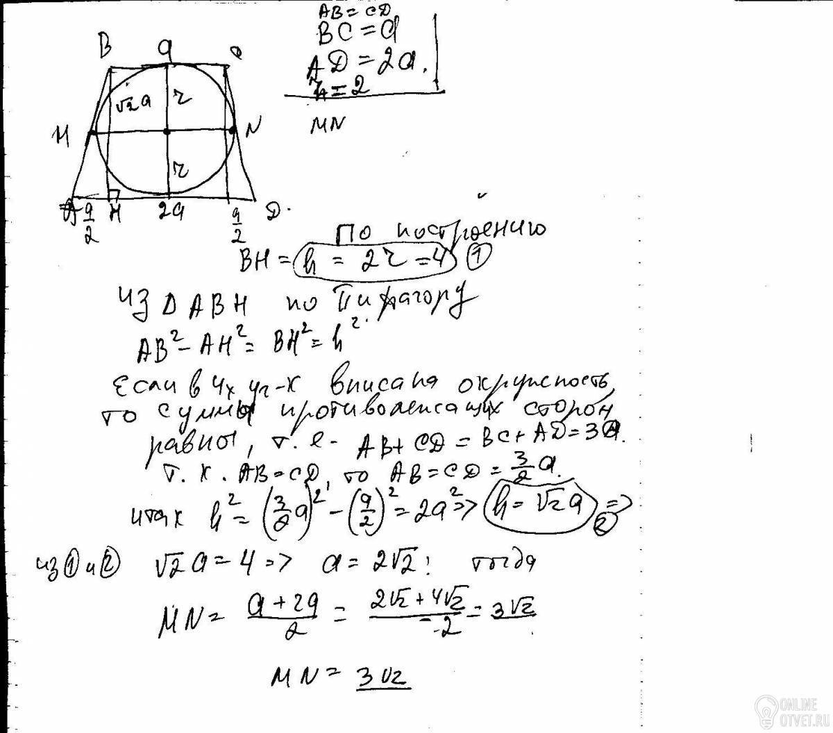 Около окружности радиуса 2 описана равнобедренная трапеция, у которой одно основание в два раза больше другого. Найдите среднюю линию трапеции.