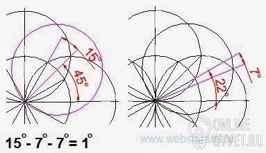 Построение угла 45 %. Возьми линейку, начерти систему координат. В результате: нарисовать три круга и провести от точки О прямую. Проверь транспортиром.