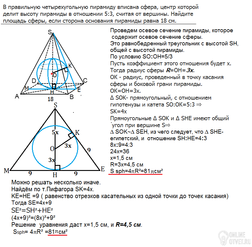 В правильную четырехугольную пирамиду вписана сфера, центр которой делит высоту пирамиды в отношении 5:3, считая от вершины. Найдите площадь сферы, если сторона основания пирамиды равна 18 см.