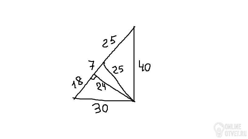 один катет=v(24^2+18^2)=v(576+324)=v900=30