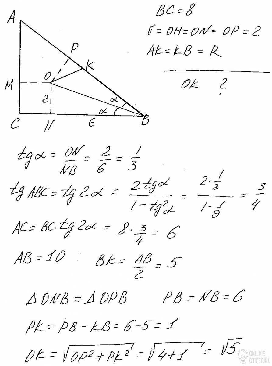 Обозначим треугольник АВС(смотри рисунок). Проведём радиусы ОМ, ОN,ОР. Обозначим точку К-центр описанной окружности, в прямоугольном треугольнике он лежит на середине гипотенузы. Далее NВ=ВС-NC=6. Когда найдём АС-становится ясно, что треугольник -"египетский"(соотношение сторон 3:4:5). Отсюда АВ=10.В дальнейшем исходим из равенства треугольников ONB и OPB (у них гипотенуза ОВ -общая и катеты ON и OP равны как радиусы). Затем по теореме Пифагора. Ответ ОК=корень из 5.