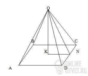 Изобразим треугольник, который соединяет в себе вершину пирамиды, центр ее основания и основание одной из апофем. Это треугольник OKN. Он прямоугольный.
