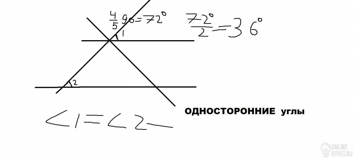 Ответ 36 градусов потому что углы односторонние,4/5 от 90=72, а биссектриса делит на 2,значит 36