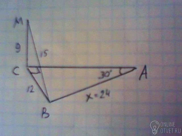 ΔАВС: ∠А=30°, АВ=2ВС=2·12=24 м.