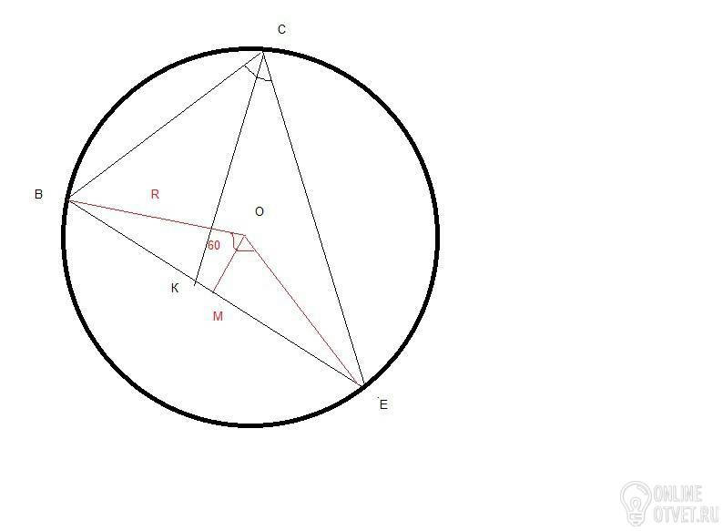т.к. угол ВОЕ центральный для угла С, то он=120 и тогда ∠ВОК=60