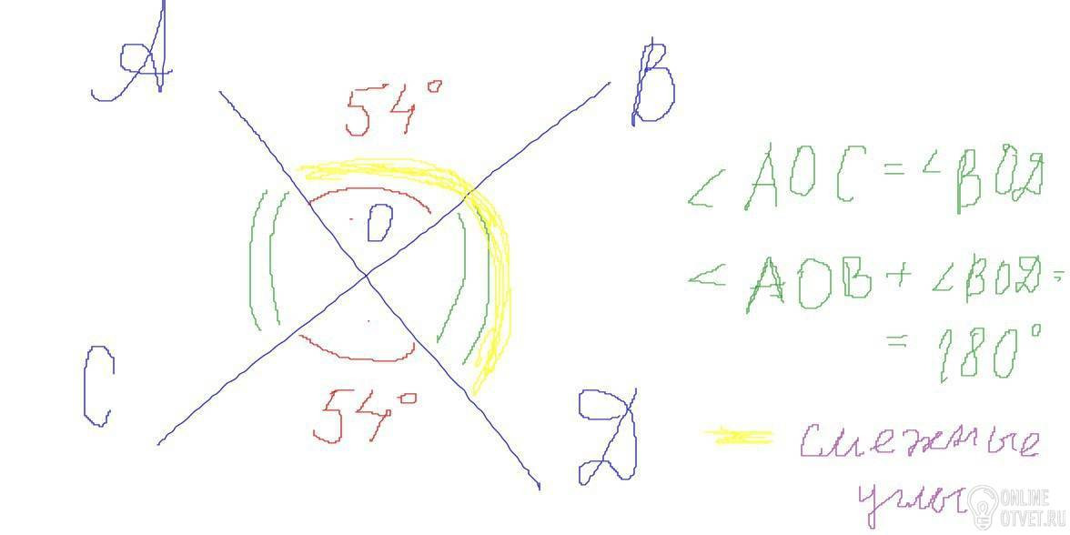 Угол АОВ=углу СОД=108:2=54 градуса, так как вертикальные углы равны.