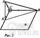 Решение: КСВА - двугранный угол. СВ - ребро двугранного угла. AC ⊥ СВ, КС ⊥ СВ, ∠ACK - линейный угол двугранного угла. По условию АВ - наклонная к плоскости α из точки А. КВ - проекция наклонной. Из ΔКАС: (по условию), (как катет, лежащий против угла в 30°). КС2 = АС2 - АК2 - по теореме Пифагора. КС2 = 42 - 22 = 12. Из ΔКСВ: По теореме Пифагора (Ответ: КВ = 2√7 см.)