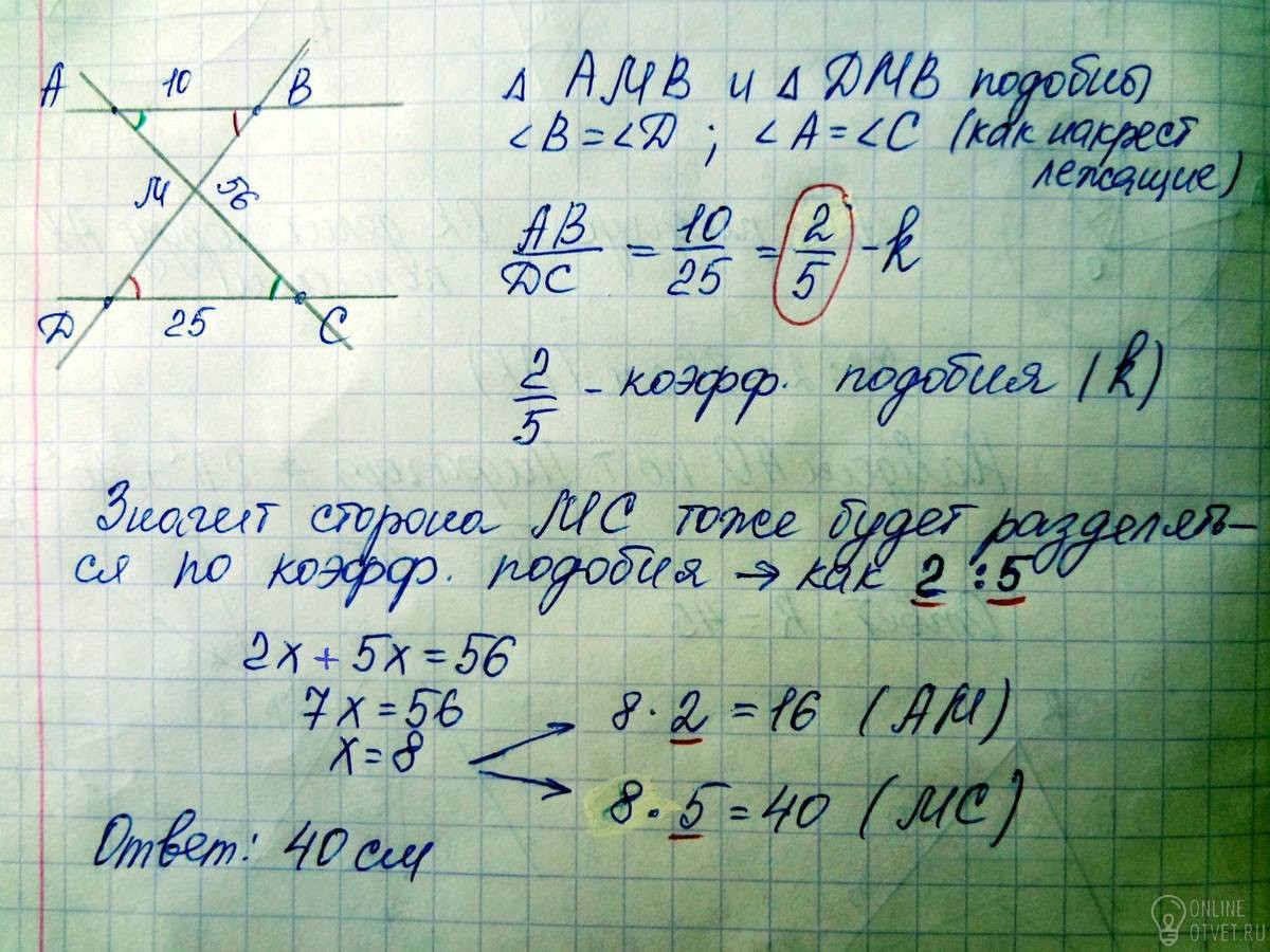 отрезки ab и dc лежат на параллельных прямых а отрезки ac и bd пересекаются в точке m. Найдите MC, если AB=10, DC=25, AC=56
