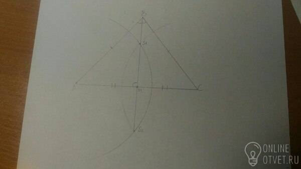 Далее, беру циркуль и строю окружность с центром в точке А произвольного радиуса,примерно равному 2/3 основания АС. Строю вторую окружность этого радиуса,но теперь с центром в точке С. Две эти окружности пересеклись в двух точках - назовем их S1 и S2. Соединяю S1 и S2, получая отрезок,который пересекает основание равнобедренного треугольника в точке М. Соединяю точки B и M в отрезок,который будет являться для равнобедренного треугольника и медианой,и биссектрисой ,и высотой. Так как это биссектриса, то нужно указать равенство двух углов - АВМ и СВМ. Так как это высота - указать это на чертеже. Так как это медиана - отметить равенство отрезков АМ и МС.