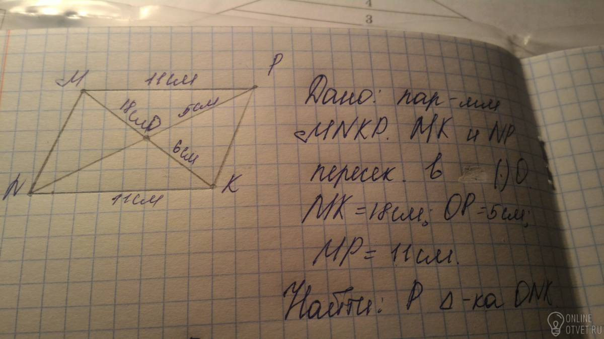 Решение: 1) МО = МОК/2 = 18/2 = 6см = ОК, т.к. диагонали пар-мма точкой пересечения дел. пополам. 2) NO = OP = 5см, т.к. (см. 1 пункт) 3) NK = MP = 11см, т.к. в пар-мме противоположные стороны равны. Значит, Р треугольника ONK = 11 + 5 + 6 = 22 см.