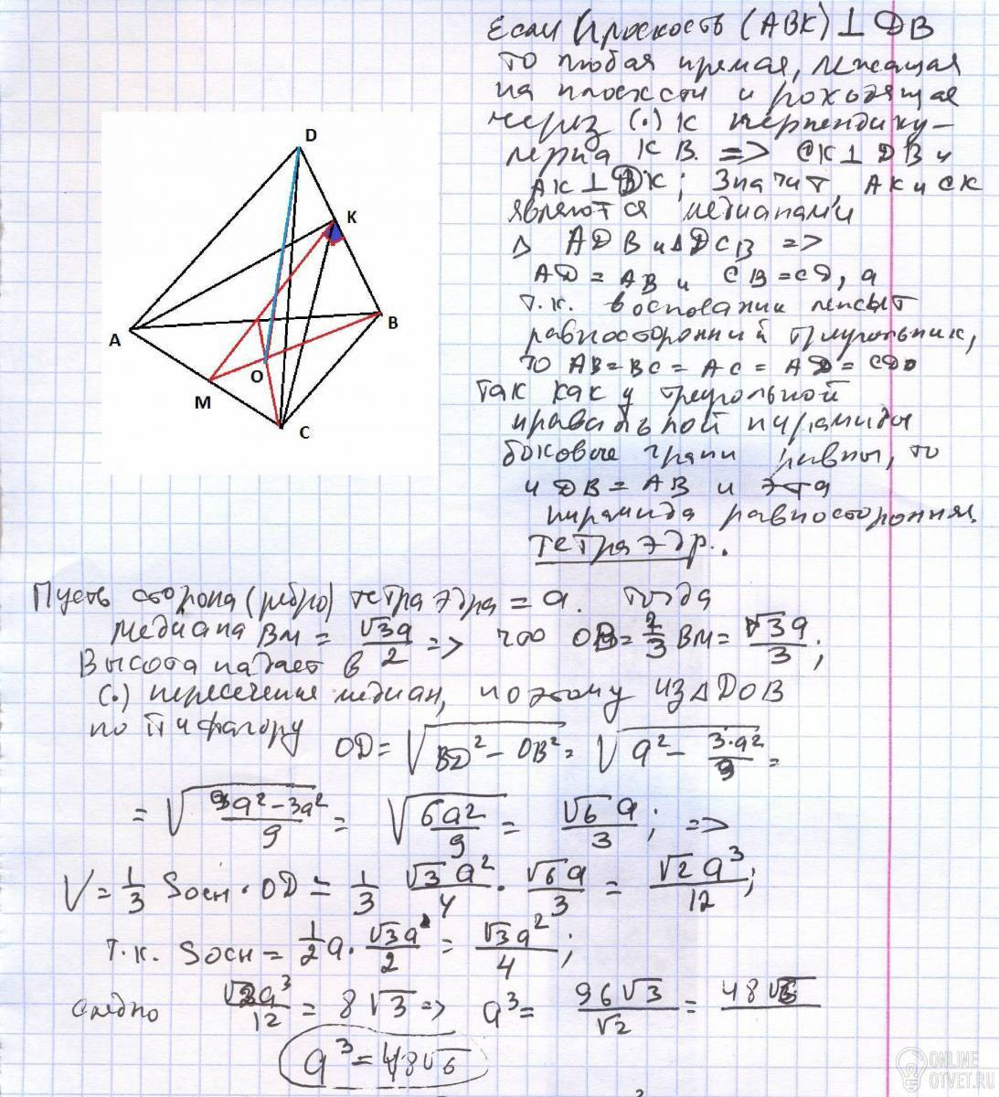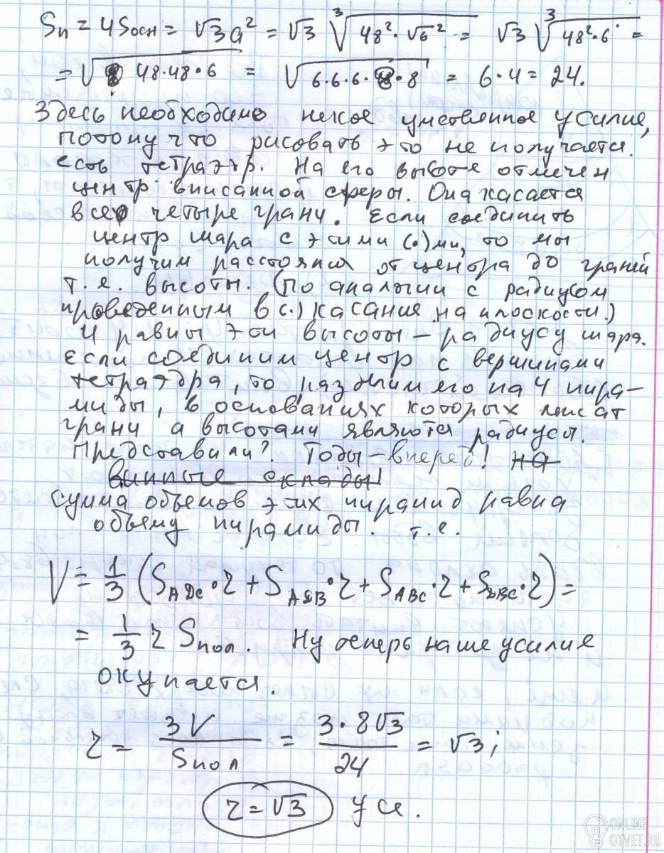Объем правильной треугольной пирамиды равен 8 корень из трех, а плоскость, проходящая через сторону основания пирамиды и центр вписанного шара , перпендикулярна противолежащему ребру пирамиды. Найдите радиус вписанного шара.