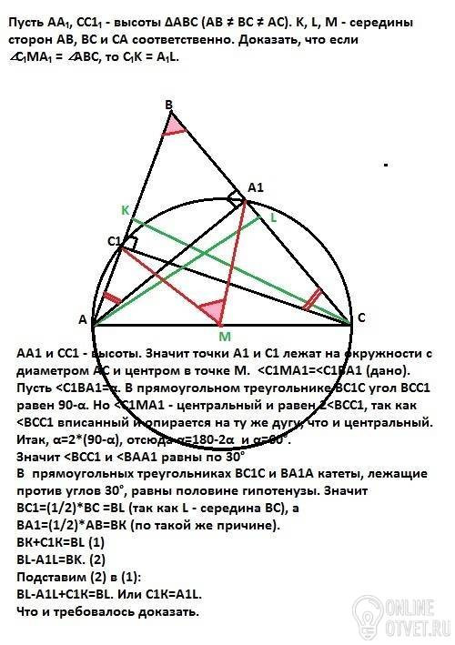 АА1 и СС1 - высоты. Значит точки А1 и С1 лежат на окружности с диаметром АС и центром в точке М. Пусть Значит В прямоугольных треугольниках ВС1С и ВА1А катеты, лежащие против углов 30°, равны половине гипотенузы.