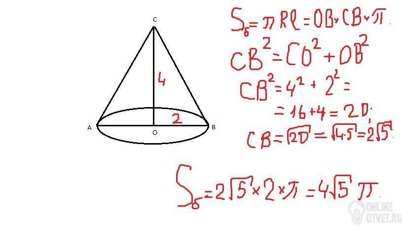 Площадь боковой поверхности конуса равна: CB*OB*pi, S = 2*sqrt(5)*2*pi = 4*sqrt(5)*pi.