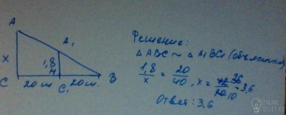 Поясняю сразу,треугольники подобны по трём углам,один угол общий,два из них равны как соответственные при пересечении параллельных прямых секущей.Тут надо быстро сообразить,что коэффициент подобия 1\2,тем самым домножив рост на 2 и получая длину столба.В подобных треугольниках равны соответственные элементы,поэтому из пропорции высота только в метрах,о чём вас просят в заключительном вопросе.