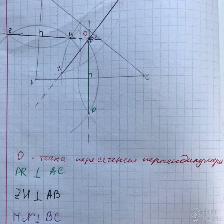 Берёшь любой разворот циркуля, иглу ставишь в точку А. Разворот циркуля должен быть примерно больше половины стороны. Делаешь небольшой полукруг. если зайдёт на другие стороны или за приделы треугольника, это неважно. Потом ставишь не меняя разворот циркуля в точку Б и делаешь такой же полукруг. Эти полукруги должны пересечься в двух точках. Соединяешь их и вот это линия которая получилась это перпендикуляр стороны АВ, на рисунке чёрным.