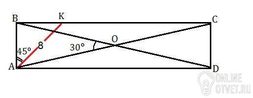 В прямоугольнике ABCD проведена биссектриса угла A до пересечения со стороной BC в точке K. Отрезок AK=8 см, угол между диагоналями прямоугольника равен 30°. Найдите стороны и площадь прямоугольника ABCD.