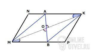 Т.к. АК и МВ лежат на сторонах параллелограмма, они параллельны, а из равенства треугольников и равны.